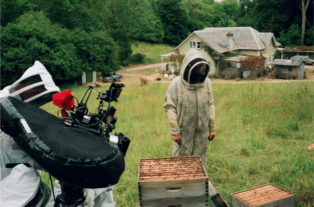 Beehives were incorporated into the set environment in consultation with local beekeepers and animal welfare experts. A meadow of wildflowers was planted in advance to create a suitable habitat, and hives were positioned away from busy crew areas to allow the bees to acclimatise safely during filming.